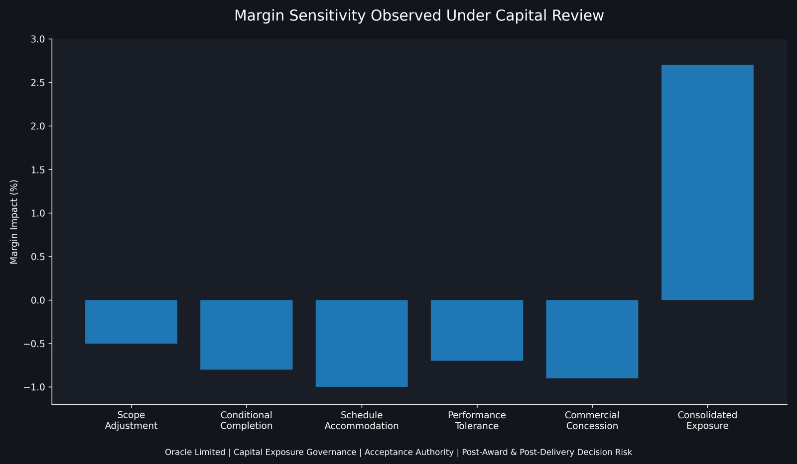 In capital-intensive environments, margin resilience is not governed solely by execution performance. It is shaped by how acceptance decisions are structured, aggregated, and preserved over time. Where delegated authority is exercised without cumulative sensitivity mapping, exposure can remain latent until financial review requires reconstruction. When authority boundaries are defined, consolidated, and traceable, margin position remains defensible under scrutiny.